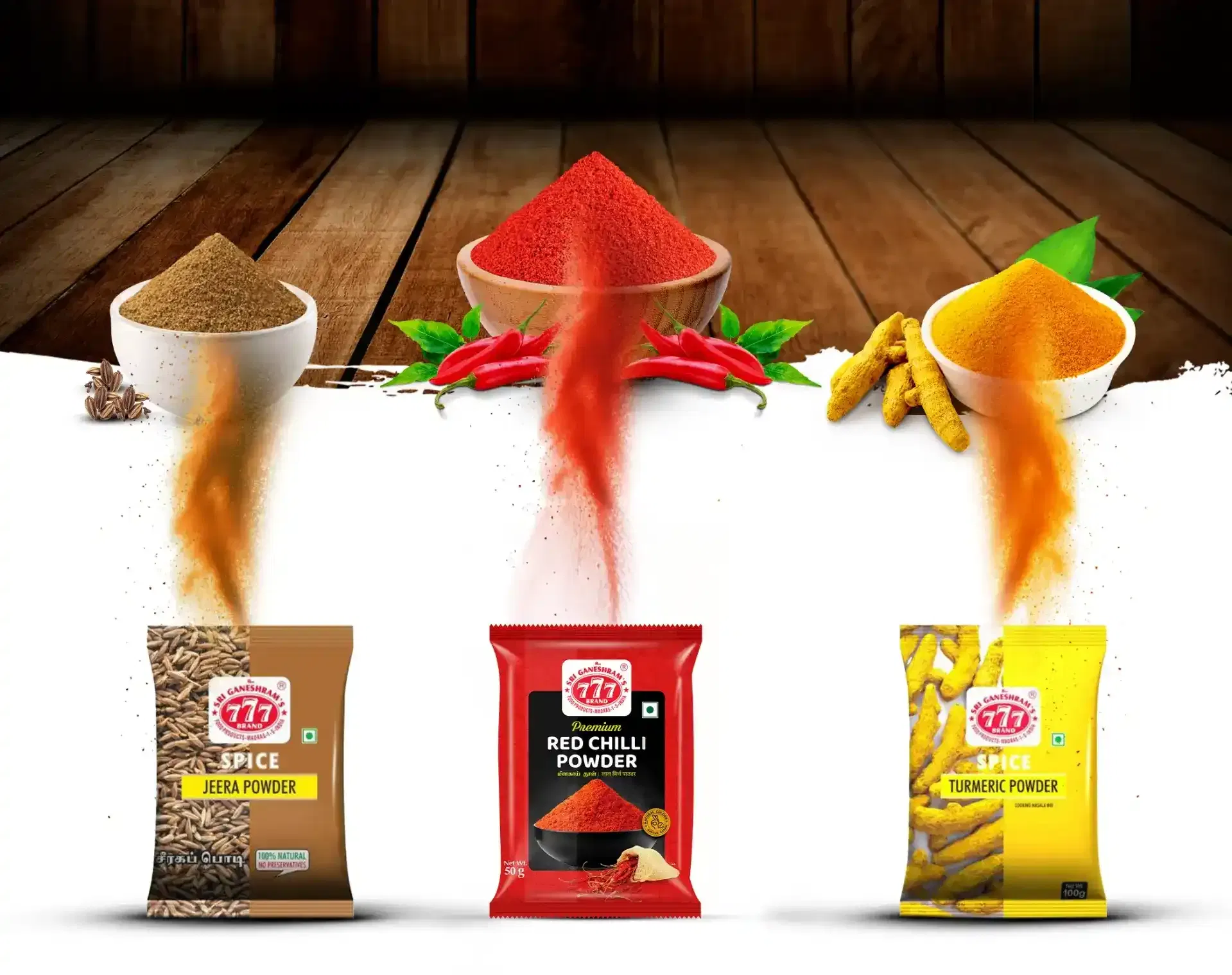 Turmeric powder, red chilli powder, jeera powder, and pepper powder are key staples.