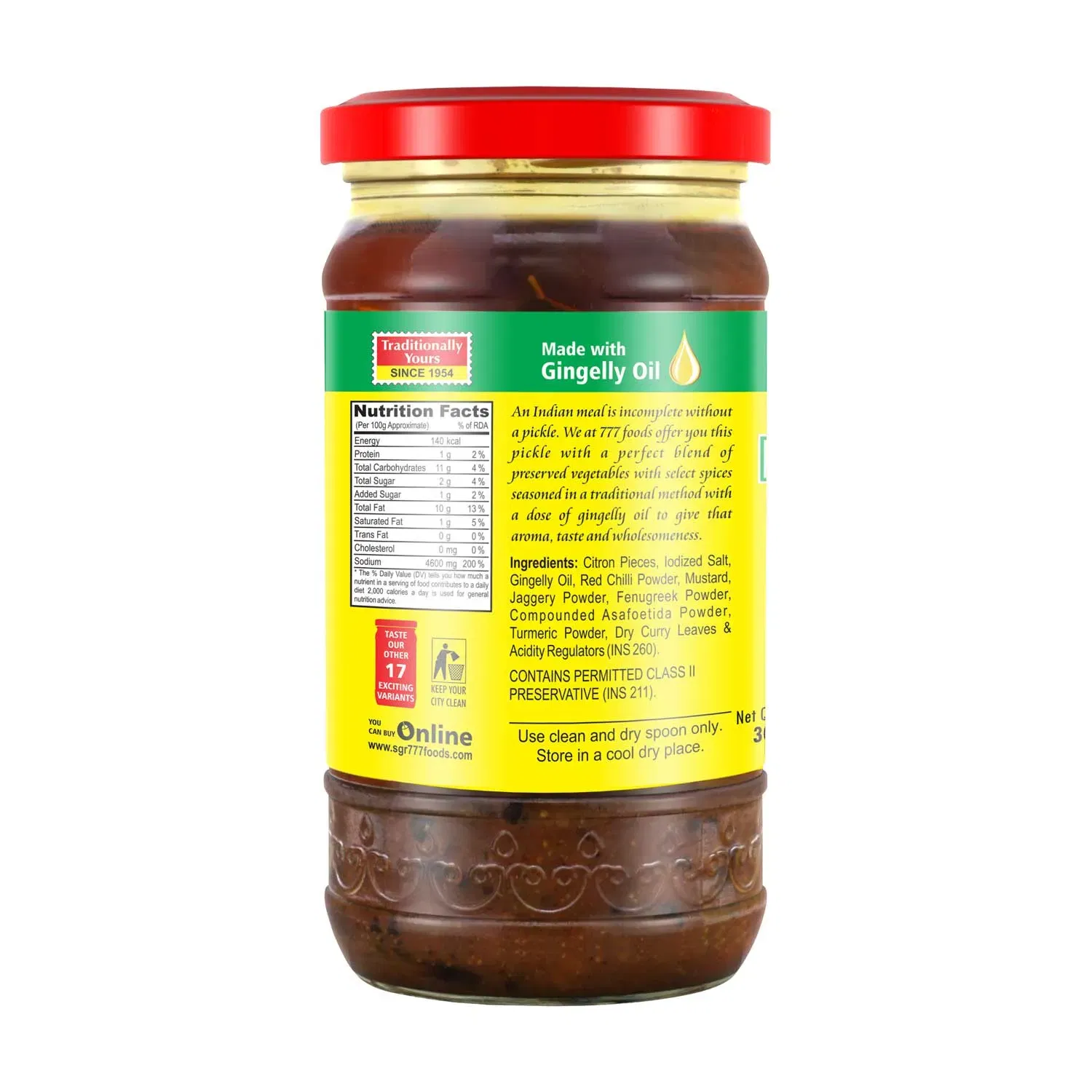 The charm of 777 citron pickle is in its roots. It’s not your regular citrus pickle. The thick rind of the citron fruit gives it a bold texture and a rich, tangy flavor that stands out. Every jar of this narthangai pickle is made using recipes passed down through generations. Fresh citron fruit meets carefully chosen spices. The result? A refreshing pickle with a bold kick. It lifts simple meals and brings that traditional touch you didn’t know you were missing.