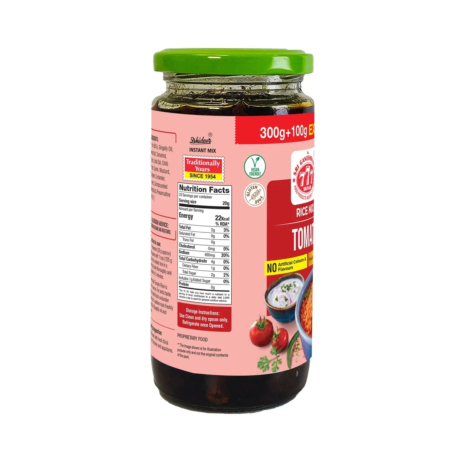 Tomato rice paste is an easy-to-use, pre-cooked, ready-to-relish condiment for delivering the rich, tangy taste of authentic south indian tomato rice​ on the table in minutes. Prepared with ripe tomatoes, fragrant spices, and with careful selection of ingredients. This tomato paste rice​ retains the flavor of home cooking without the preparation time. If you don't have time, or are yearning for a genuine tomato rice experience, this paste provides a quick and delicious fix.